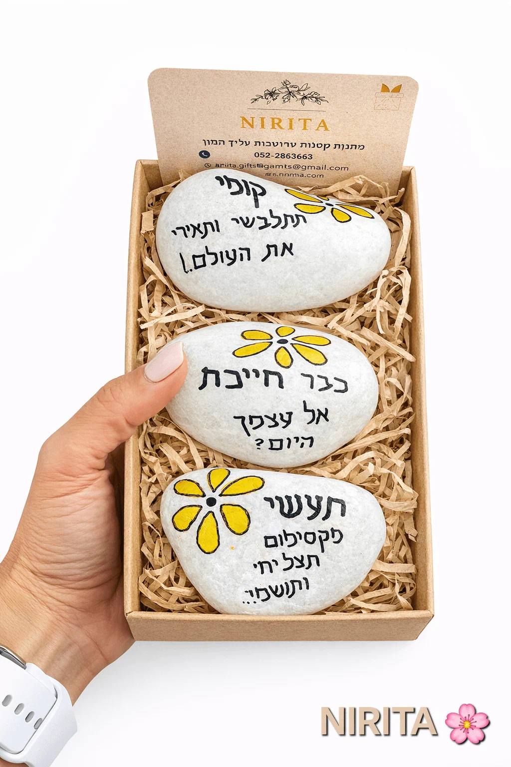 לפעמים, כל מה שצריך כדי להתחיל את היום כמו שצריך הוא תזכורת קטנה לכוח שלנו. שלוש אבנים ייחודיות, מאוירות בעבודת יד על חלוקי נחל טבעיים, עם מסרים שיעוררו בך מוטיבציה, חיוך ועוצמה פנימית.