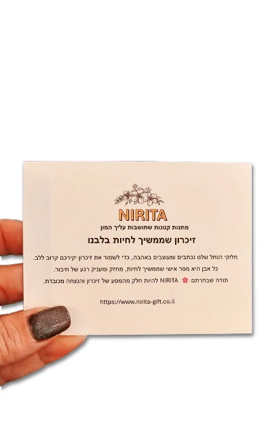 מחיר בסיס: 6 ש"ח בלבד כולל אריזת מתנה מוקפדת — קופסת קרטון עם מכסה שקוף, עטיפה מכובדת וכרטיס ברכה "זיכרון שממשיך לחיות בלבנו".