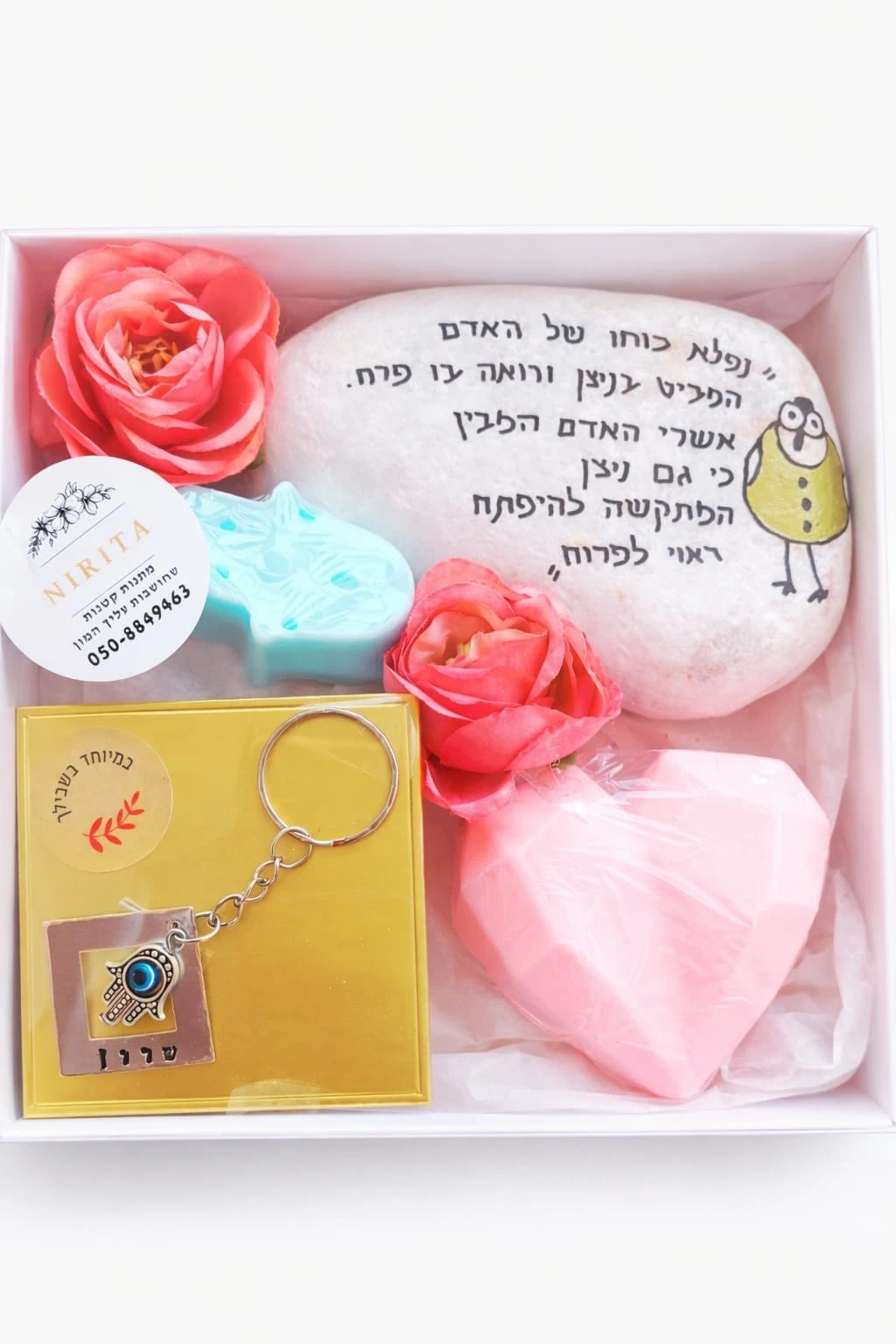 💎 אבן השראה בעבודת יד – עם הכיתוב: "נפלא כוחו של האדם המביט בניצן ורואה בו פרח. אשרי האדם המבין כי גם ניצן המתקשה להיפתח, ראוי לפרוח."